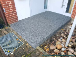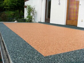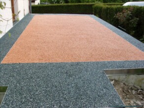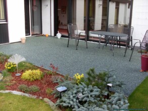 Auch für den Außenbereich eignen sich Steinteppiche ganz ausgezeichnet. Regenwasser wird durch die offenen Poren abgeleitet, sodass sich keine Pfützen bilden und Moos oder Algen keine